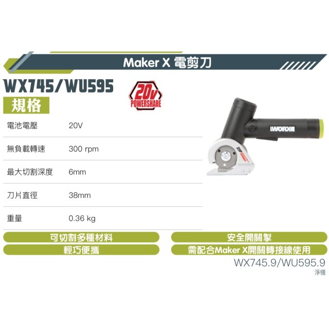 WORX威克士 20V MAKER X 電剪刀(WU745.9)(淨機)