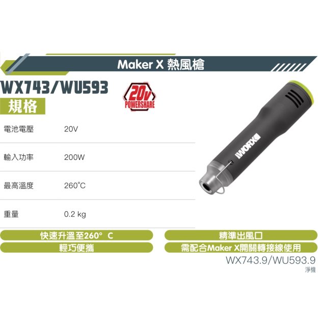 WORX威克士 20V MAKER X 熱風槍(WX743.9)(淨機)