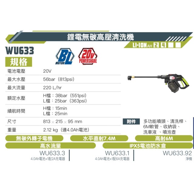 WORX威克士 20V鋰電無碳高壓清洗機(WU633.92)(淨機)