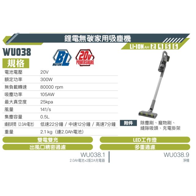 WORX威克士 20V無刷家用吸塵機(WU038.1)