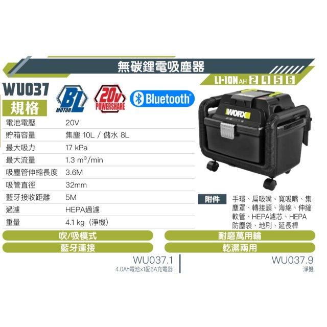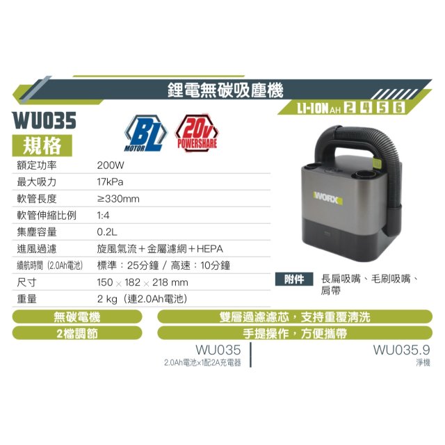 WORX威克士 20V無刷吸塵機(WU037.1)