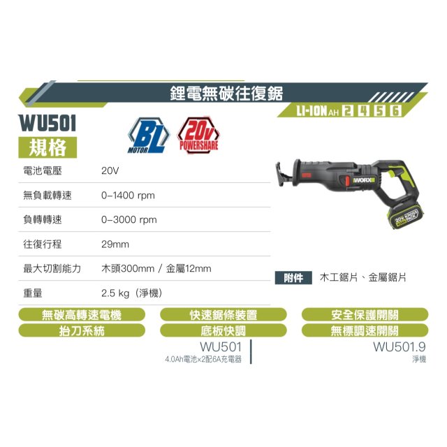 WORX威克士 20V無刷鋰電往復鋸(重裝)(WU501)