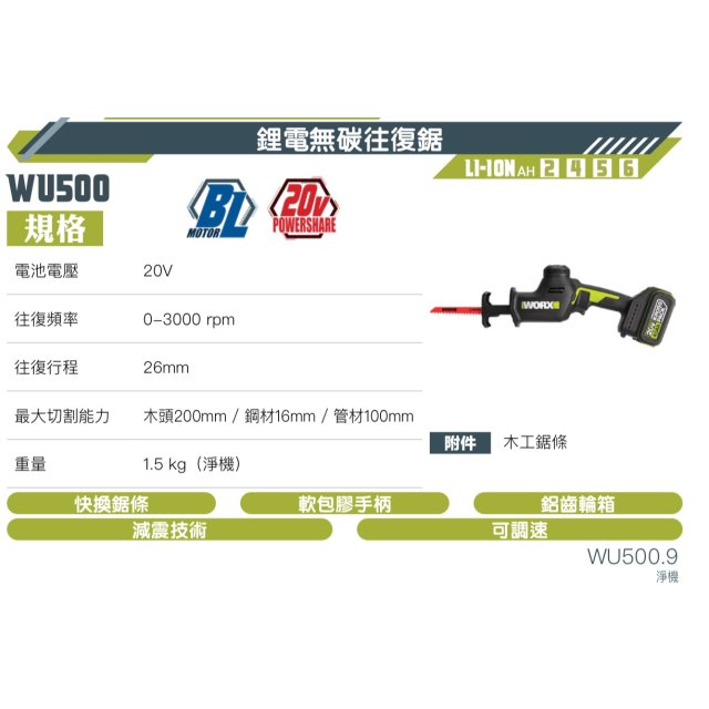 WORX威克士 20V 26mm無刷往復鋸(WU500.1)