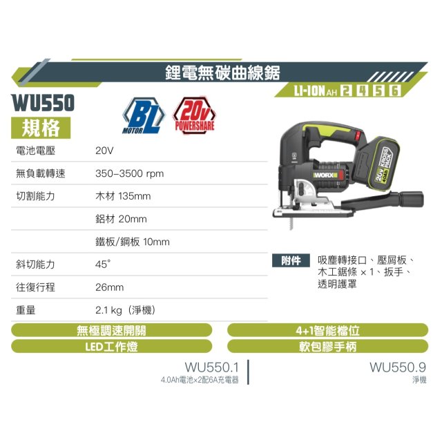 WORX 20V 無刷鋰電曲線鋸 (淨機)(WU550.9)
