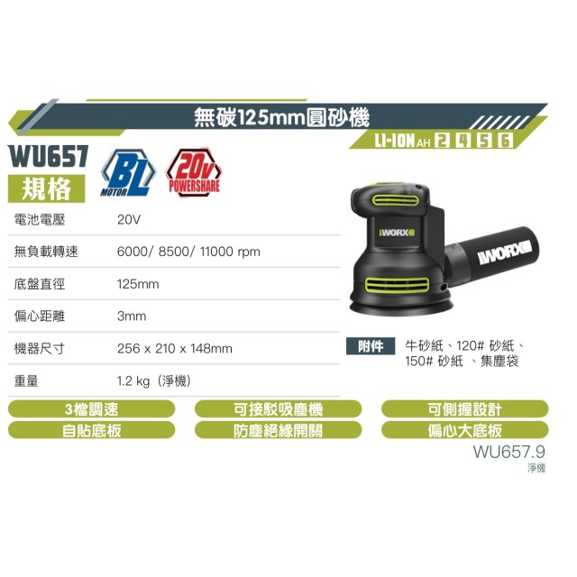 WORX 20V無刷125mm圓砂機(WU657.9)(淨機)