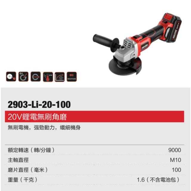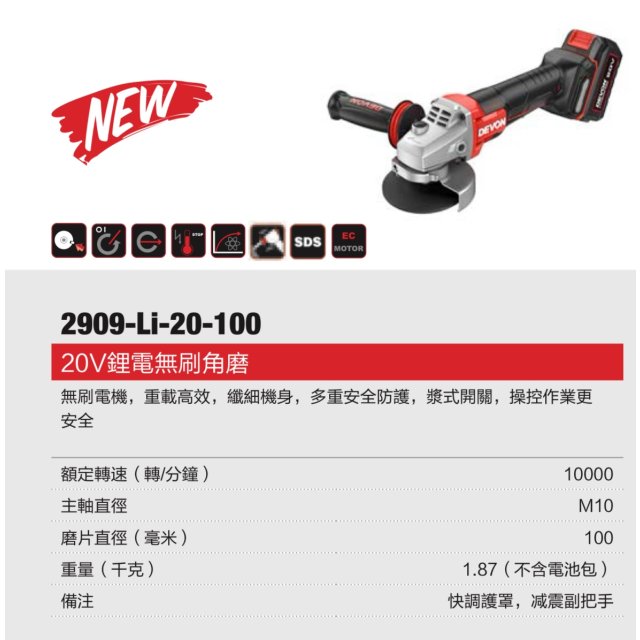 DEVON大有 20V4寸角磨機(2909-Li-100-Z)(淨機)