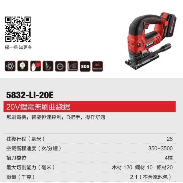 DEVON大有20V積梳鋸(5832Li-Z)(淨機)