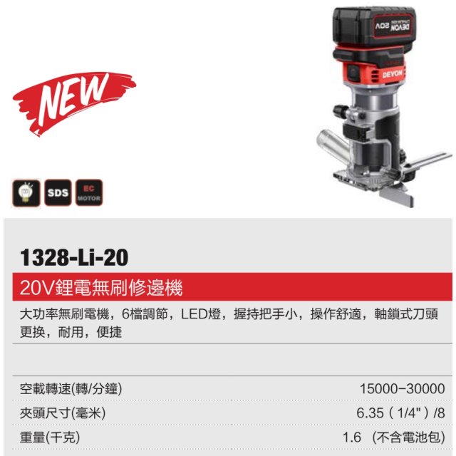 DEVON大有 20V無刷羅機(1328Li-Z)(淨機)