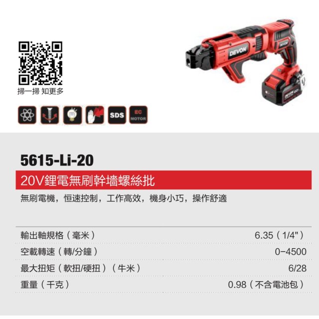 DEVON大有 20V無刷乾牆螺絲批(5615Li-Z)(淨機)