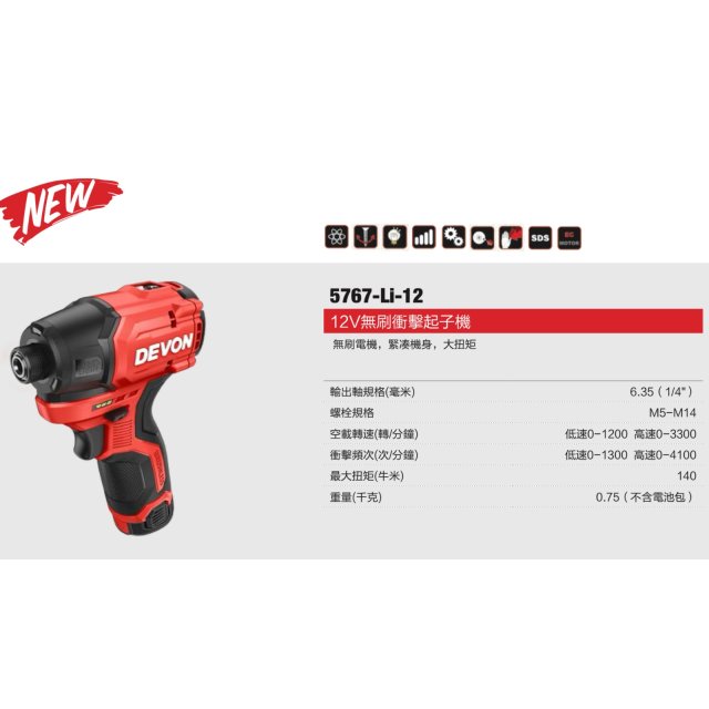 DEVON大有 12V 無刷衝擊起子批(5767-Li-12)(2電1標充)
